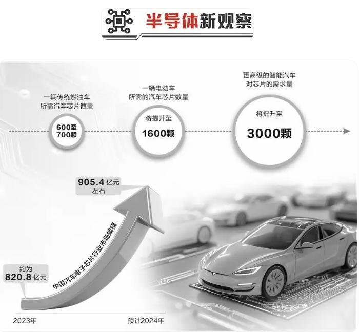 據(jù)機(jī)構(gòu)預(yù)測,2023年中國汽車電子芯片行業(yè)市場規(guī)模約為820.8億元,預(yù)計(jì)2024年增至905.4億元左右。