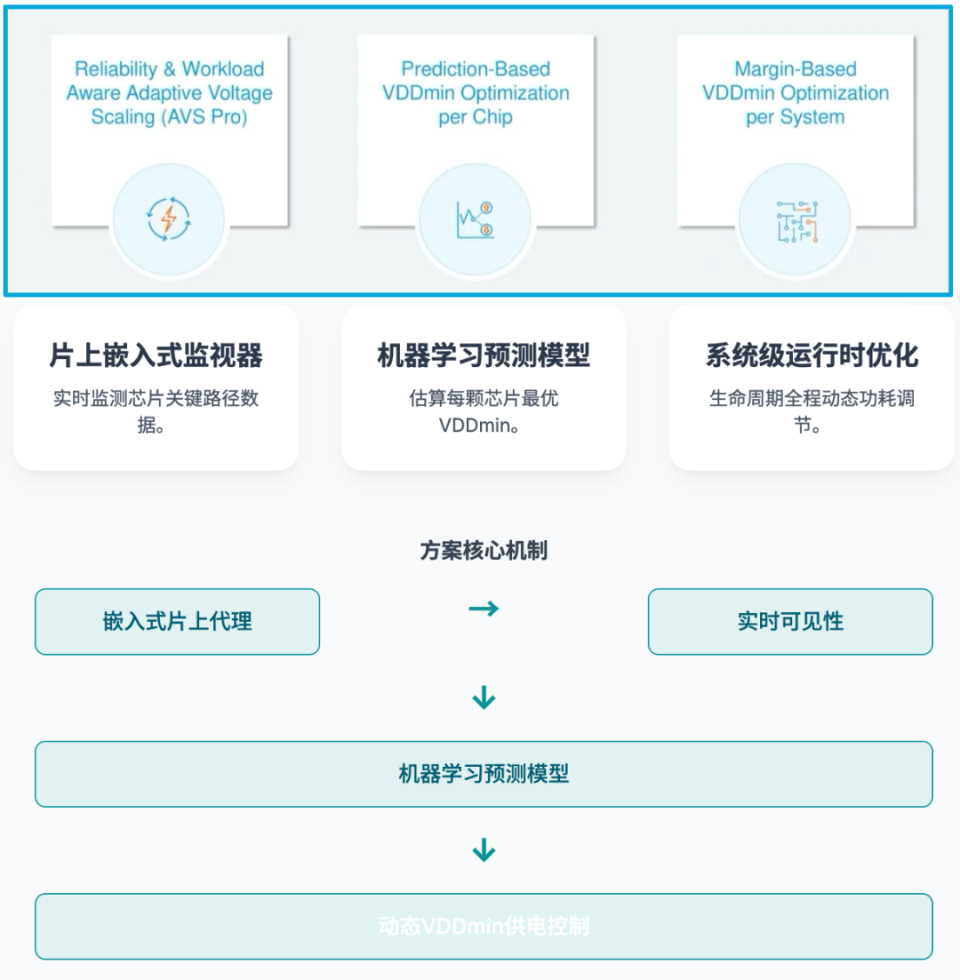 其核心機(jī)制在于:通過嵌入式片上代理(embedded agents)對芯片關(guān)鍵路徑進(jìn)行實時監(jiān)測,結(jié)合機(jī)器學(xué)習(xí)模型預(yù)測每顆芯片、每一運行環(huán)境下的最優(yōu)VDDmin,從而實現(xiàn)更為精細(xì)的動態(tài)供電控制。