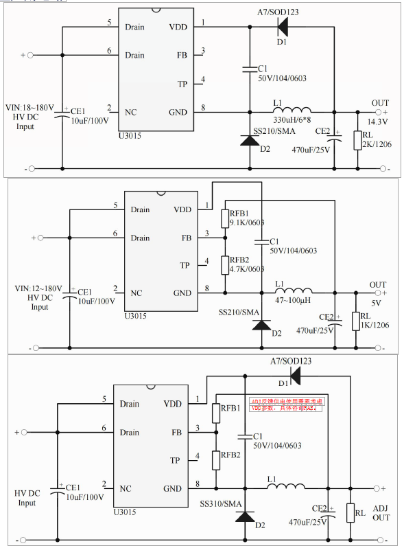 •主要特點:WN: 12~180V(OUT:ADJ);集成 2.5A 180V MOS;集成 200V 高壓啟動電路;多模式控制、無異音工作;支持降壓和升降壓拓撲;默認14.3V 輸出(FB 腳懸空);待機功耗低于 50mw;良好的線性調整率和負載調整率;集成軟啟動電路;內部保護功能:過載保護(OLP);逐周期電流限制(OCP);輸出過壓保護(OVP);VDD 過壓、欠壓和電壓箝位保護。